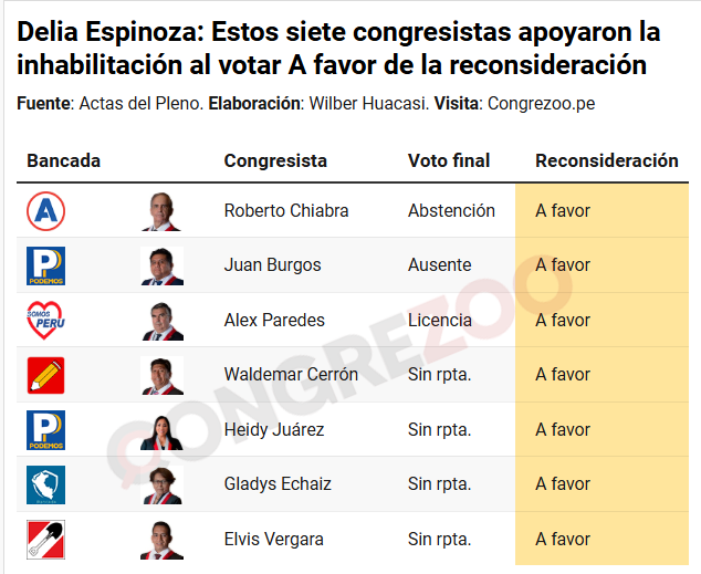 Hay siete congresistas que si bien no votaron a favor de la inhabilitación de Delia Espinoza, ayudaron directamente con sus votos para que el tema se vuelva a revisar en el pleno del Congreso. Es decir, el caso ya estaba archivado pero estos siete ayudaron con sus votos para que el caso retorne al pleno con el resultado que ya todos conocemos. Entre ellos se encuentra Roberto Chiabra (APP) y la exfiscal de la nación Gladys Echaíz.